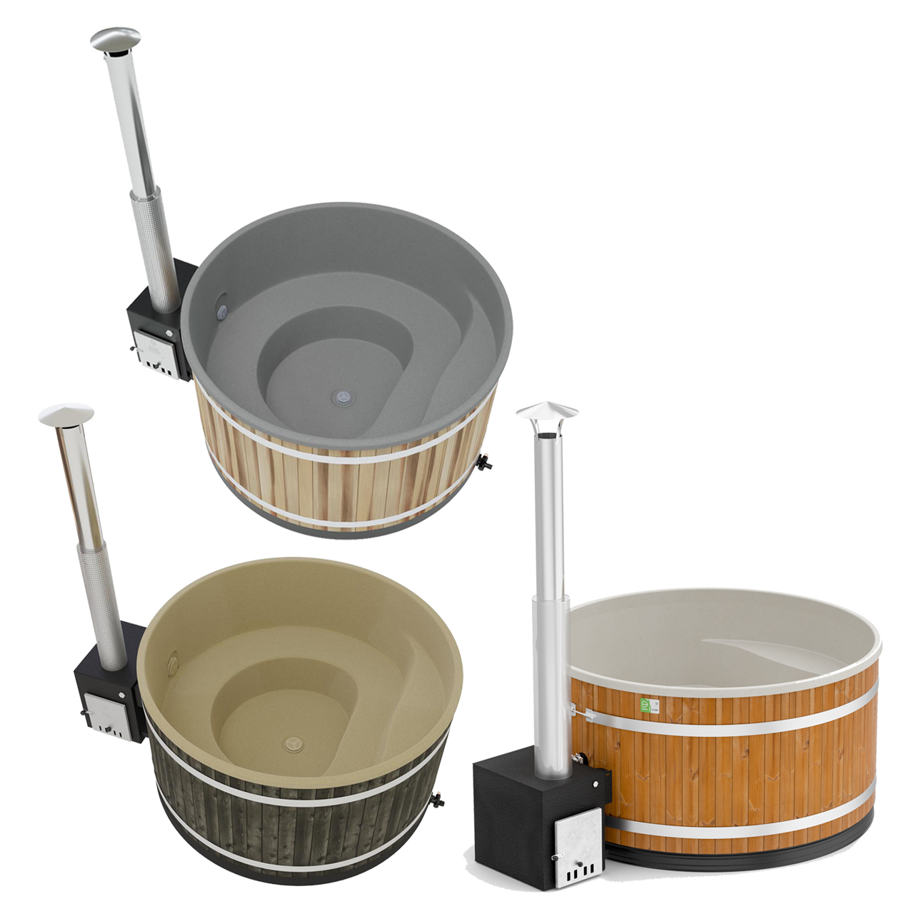 Das Innenbecken besteht aus hochwertigem, pflegeleichtem LDPE-Kunststoff, der besonders langlebig und leicht zu reinigen ist. Die Verkleidung ist in unterschiedlichen Außenfarben wie Thermoholz, Fichte, Eco Plank oder Red Cedar erhältlich. Innen stehen die Farbvarianten Soft Beige oder Light Gray zur Auswahl. Diese können auf Wunsch mit stimmungsvoller LED-Beleuchtung für ein harmonisches Ambiente aufgerüstet werden.