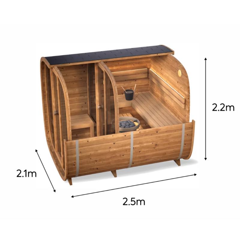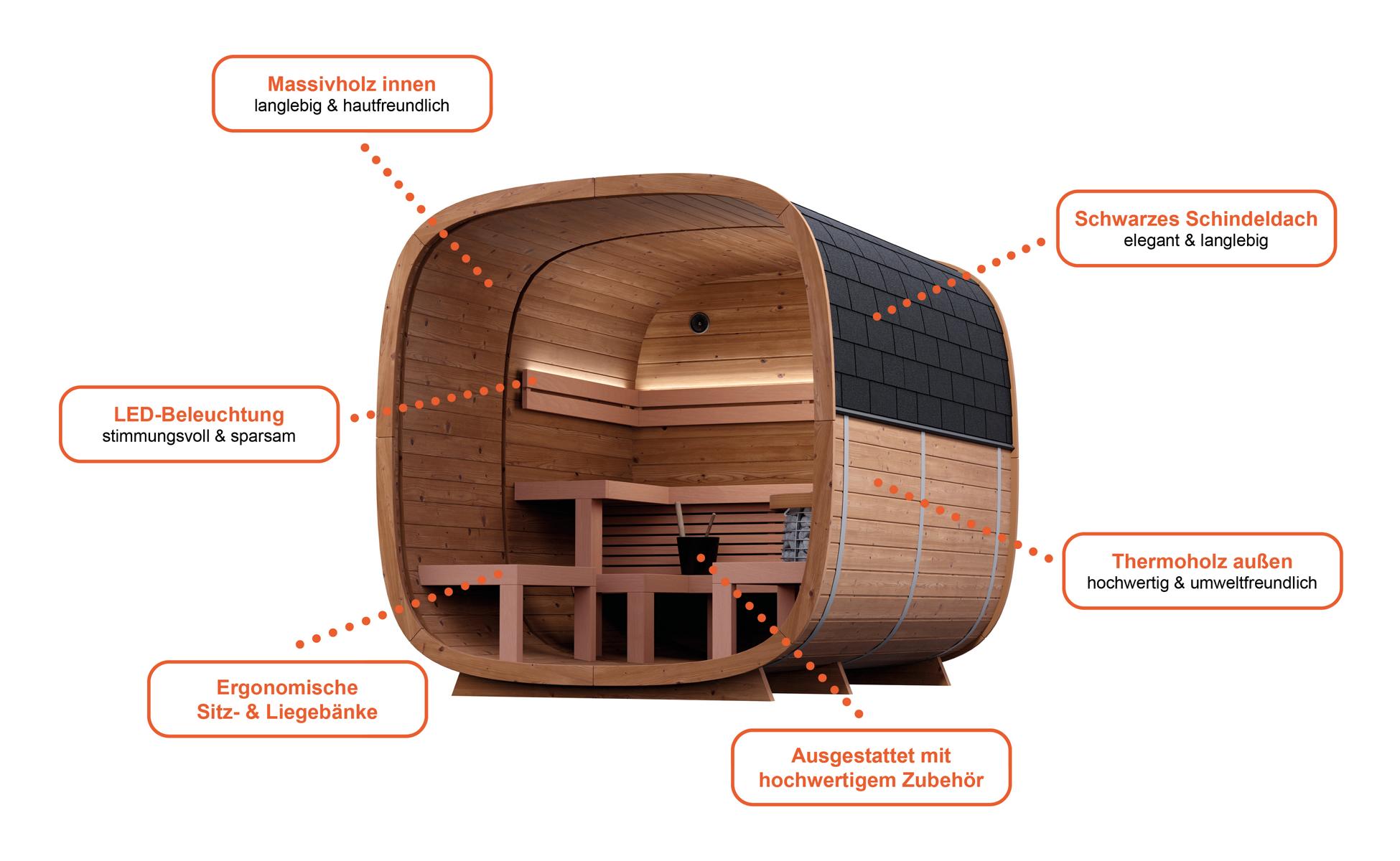 Geräumige Außensauna für 5 Personen (ca. 9,2 m³) mit Hoch- und Unterbank, optionale Glasfront, schwarzem Schindeldach & durchdachter Lüftung.
