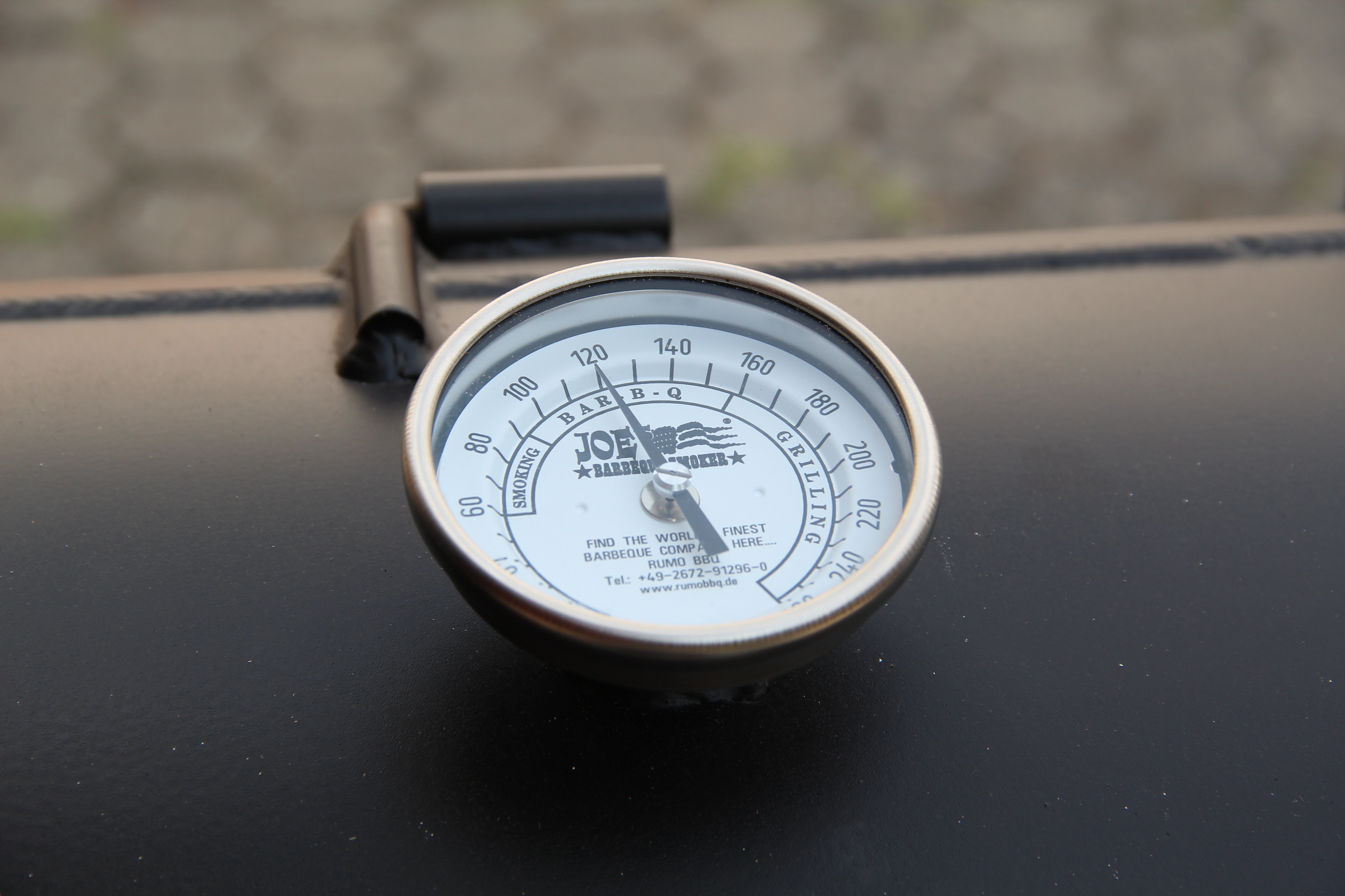 Durch den Kamineffekt strömt die heiße Luft durch die Garkammer, durch Öffnen bzw. Schließen der seitlichen Lüftungsklappen können Sie die Temperatur stufenlos regeln. An dem fest installierten Edelstahlthermometer können Sie die Temperatur jederzeit bequem und einfach ablesen.