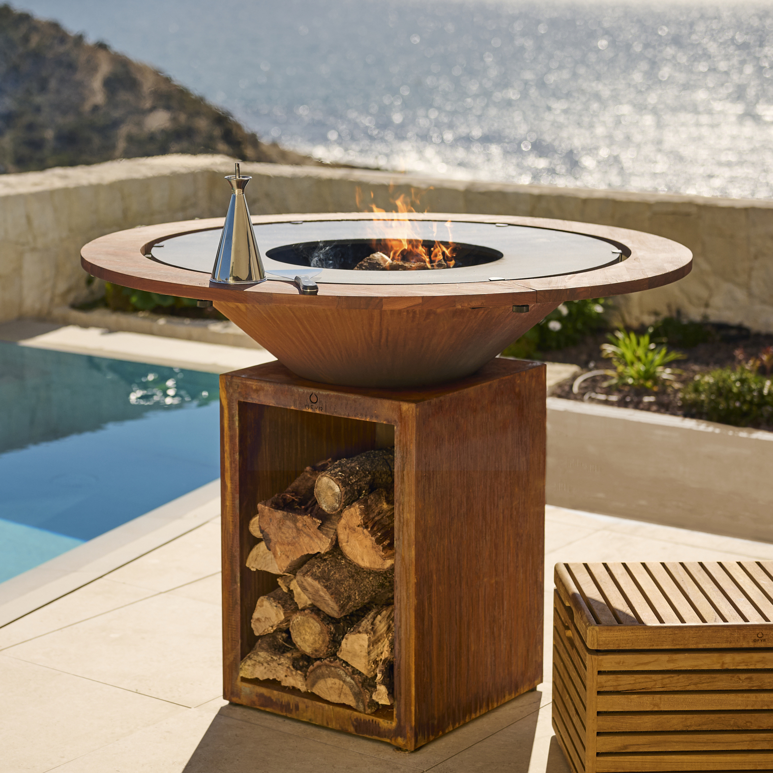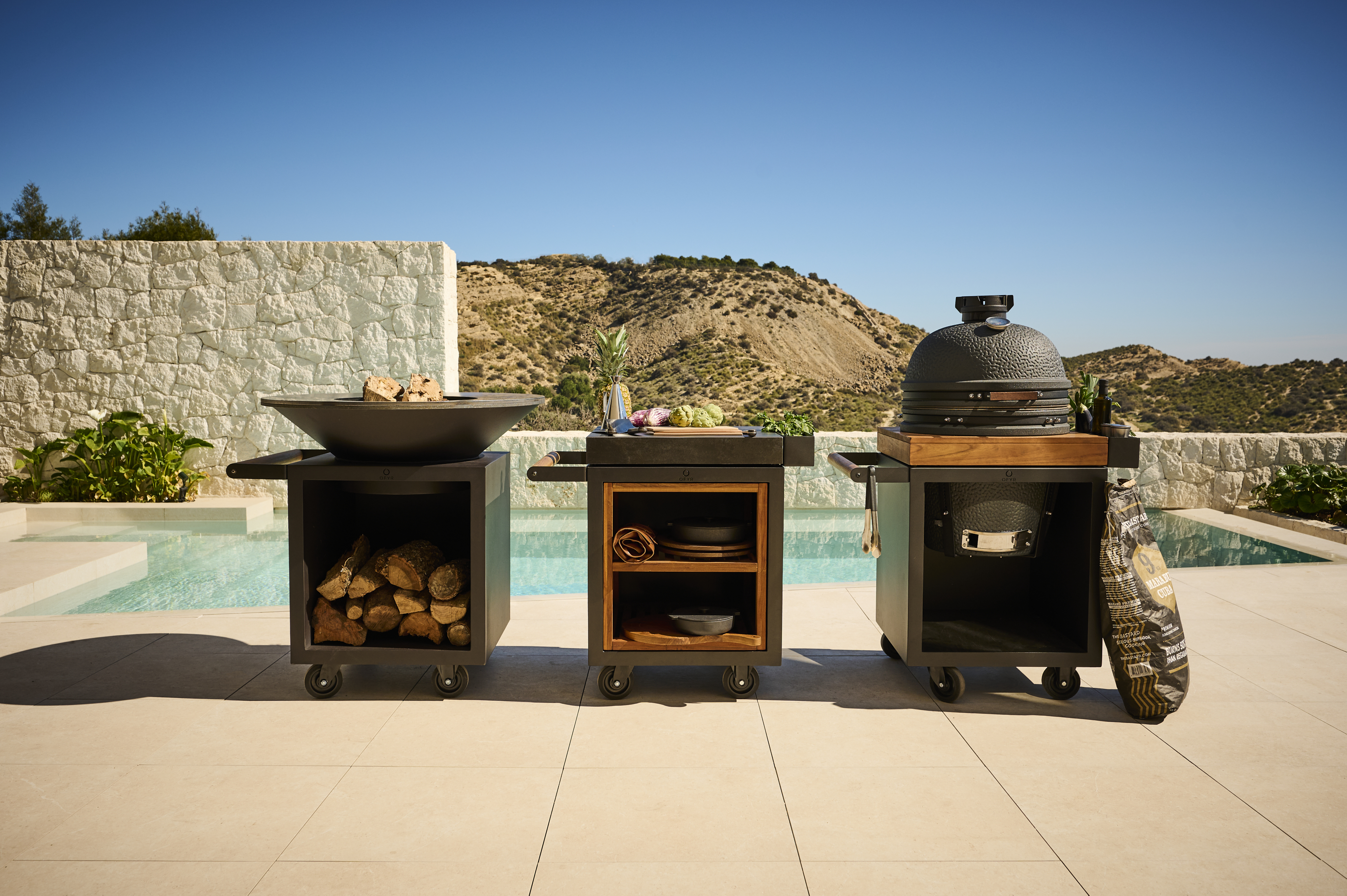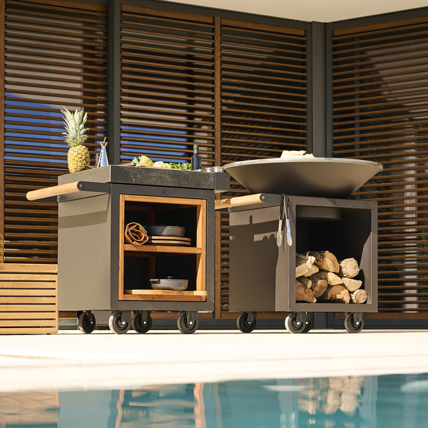 Ein weiteres Highlight sind die OFYR-Elemente, die das Kocherlebnis erweitern. Dazu zählen stilvolle Mise-en-Place-Tische, die für Ordnung sorgen, sowie funktionale Aufbewahrungslösungen wie Holzlager und praktische Gartenbänke.